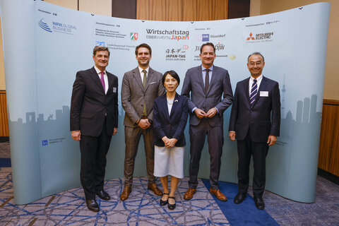 Bildunterschrift v.l.n.r.: Christian Zaum, Wirtschaftsdezernent der Landeshauptstadt Düsseldorf; Paul Höller, Staatssekretär im Ministerium für Wirtschaft, Industrie, Klimaschutz und Energie des Landes Nordrhein‑Westfalen; Setsuko Kawahara, japanische Generalkonsulin in Düsseldorf; Felix Neugart, Geschäftsführer von NRW.Global Business; Akira Sato, Präsident der japanischen Industrie- und Handelskammer zu Düsseldorf e. V.. © NRW.Global Business/Jan Tepass