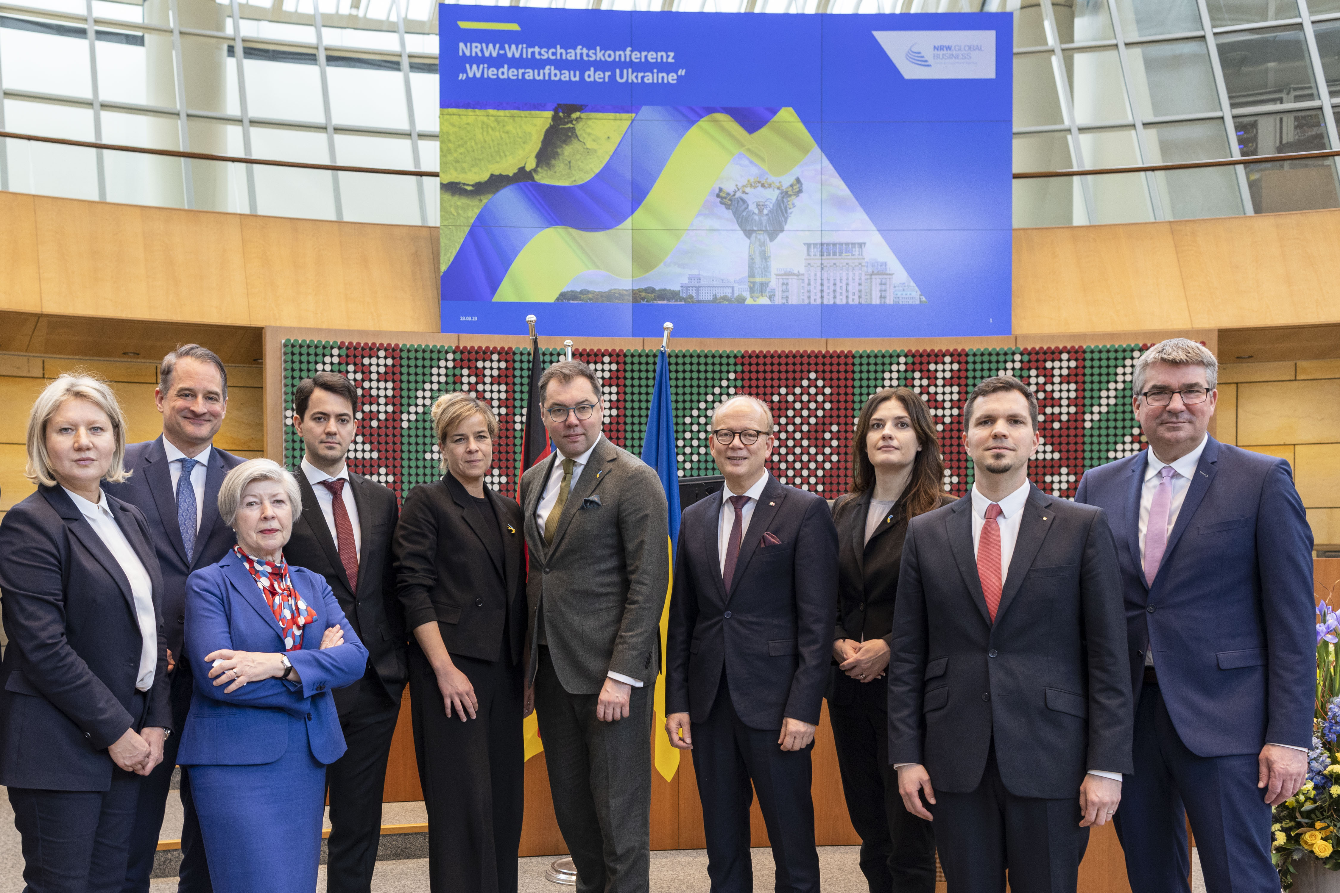 Bildunterschrift (v.l.n.r.): Elena Matekina, General Manager CEE, MENA NRW.Global Business GmbH; Felix Neugart, Geschäftsführer NRW.Global Business GmbH; Jutta Kruft-Lohrengel, Vizepräsidentin der IHK NRW; Oleksandr Rodnyansky, Wirtschaftsberater des ukrainischen Präsidenten; Mona Neubaur, Ministerin für Wirtschaft, Industrie, Klimaschutz und Energie des Landes Nordrhein‑Westfalen; S.E. Oleksii Makeiev, außerordentlicher und bevollmächtigter Botschafter der Ukraine in der Bundesrepublik Deutschland; André Kuper, Präsident des Landtags Nordrhein‑Westfalen; Iryna Shum, Generalkonsulin der Ukraine in Düsseldorf; Stefan Kägebein, Regionaldirektor Osteuropa Ost-Ausschuss der Deutschen Wirtschaft e.V.; Wulf-Christian Ehrich, stellv. Hauptgeschäftsführer IHK zu Dortmund bei der NRW-Wirtschaftskonferenz „Wiederaufbau der Ukraine“ am 23.03.2023 im Düsseldorfer Landtag.