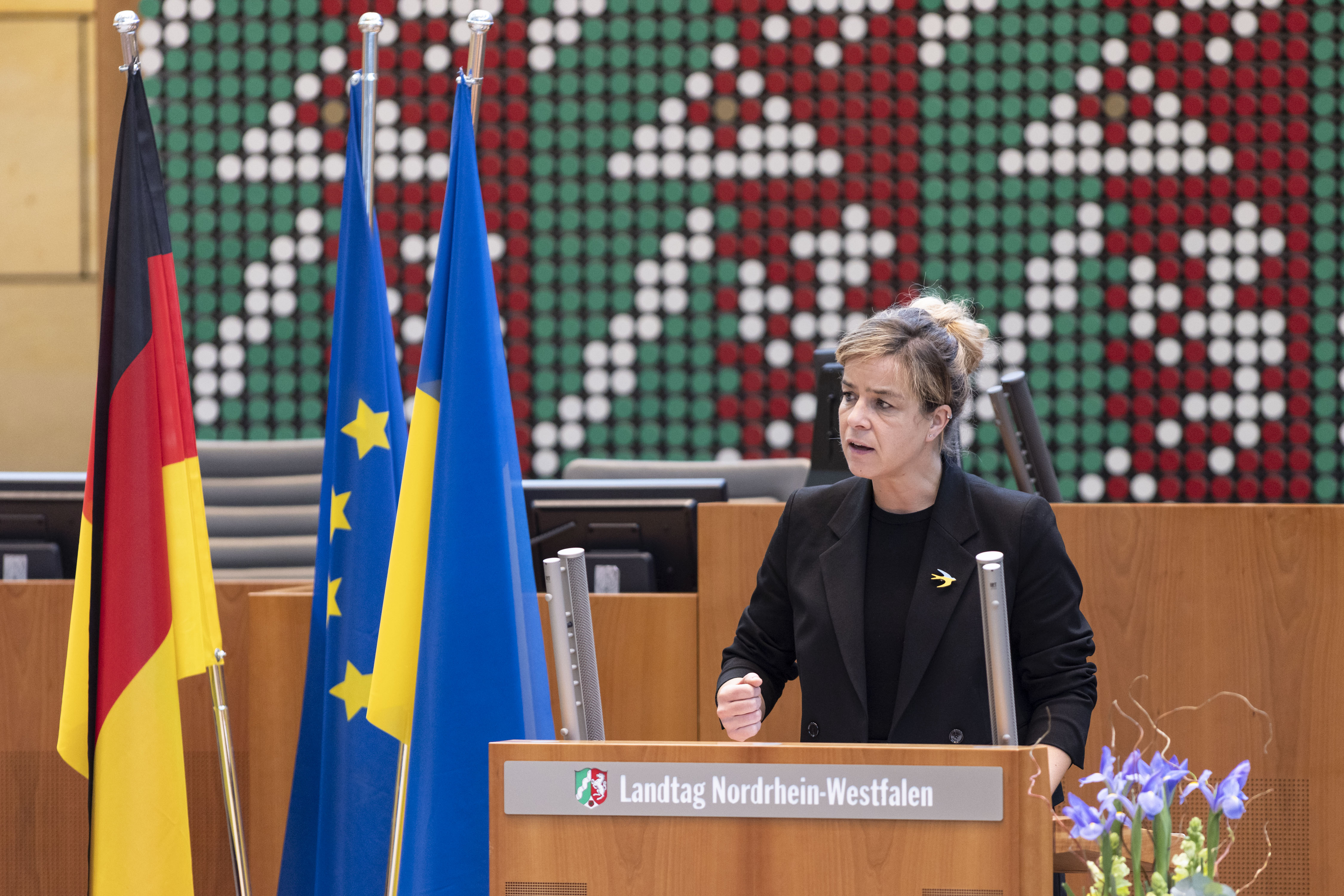 Bildunterschrift: Mona Neubaur, Ministerin für Wirtschaft, Industrie, Klimaschutz und Energie des Landes Nordrhein‑Westfalen bei der NRW-Wirtschaftskonferenz „Wiederaufbau der Ukraine“ am 23.03.2023 im Düsseldorfer Landtag.
