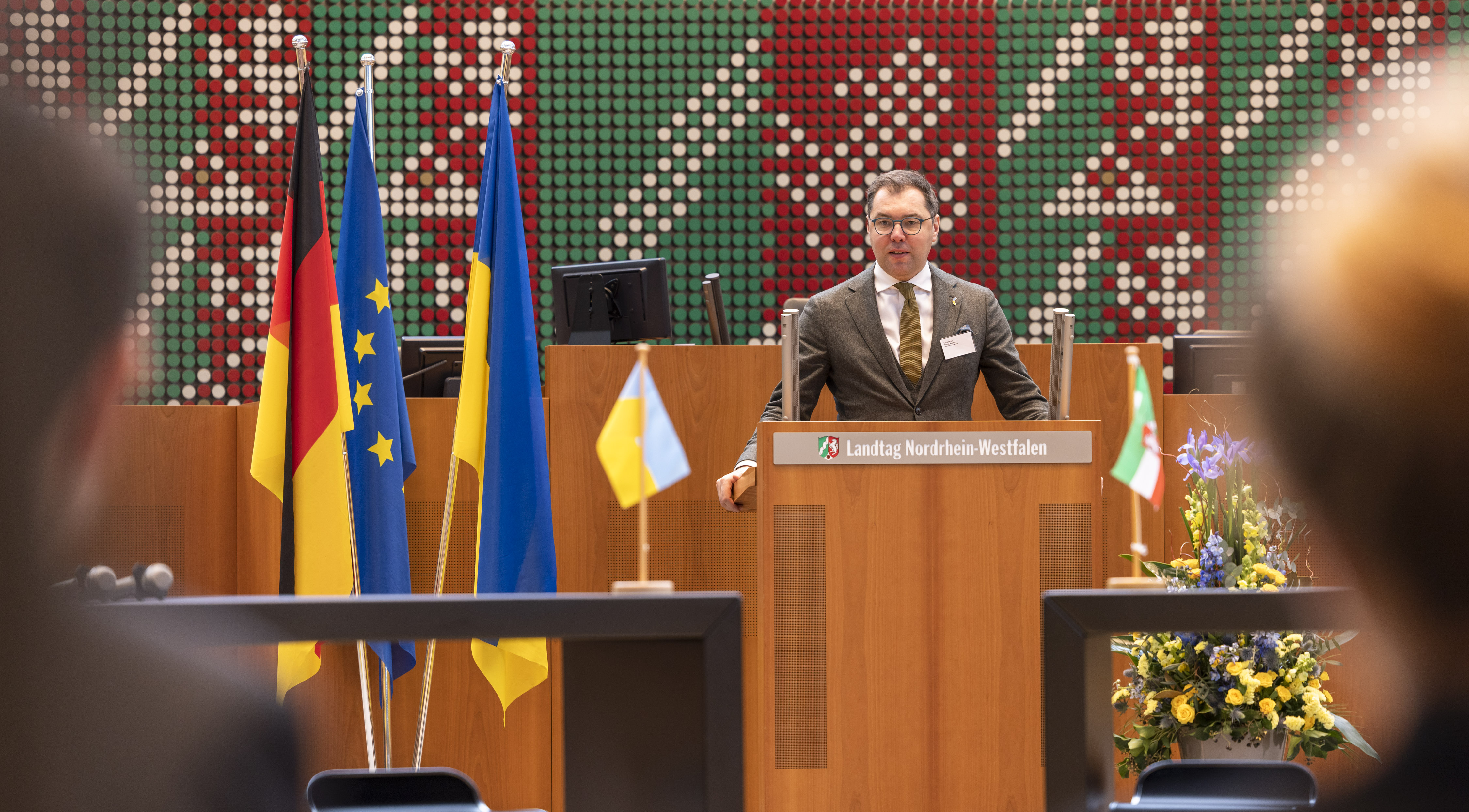 Bildunterschrift: S.E. Oleksii Makeiev, außerordentlicher und bevollmächtigter Botschafter der Ukraine in der Bundesrepublik Deutschland bei der NRW-Wirtschaftskonferenz „Wiederaufbau der Ukraine“ am 23.03.2023 im Düsseldorfer Landtag.