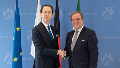 写真:Land NRW <2019年10月8日> NRW州首相官邸で握手するアルミン・ラシェットNRW州首相〔2021年1月よりドイツ政権与党CDU党首を兼務〕(右)と福島県の内堀雅雄県知事(左)